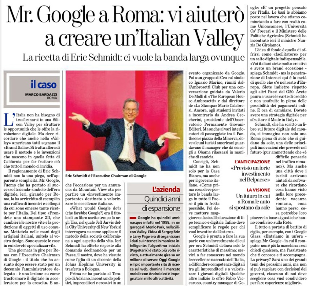 L’Executive Chairman della Google Inc., passeggiando per Roma ha immaginato cosa possa raffigurare come ricetta ideale per l’Italia per uscire dalla crisi e spiccare (nuovamente) il volo nella produzione, con il “Made in Italy” vittima, nell’ultimo periodo, di contraffazioni e di una concorrenza spietata, oltre che di uno scarso sostegno da parte delle Istituzioni.