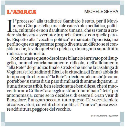 Amareggiato e affranto da una situazione irreversibile che solo attraverso un radicale cambio culturale riusciremo a sconfiggere. Quella rivoluzione culturale che Grillo professava non c’è stata, ma nel panorama politico oggi sono presenti gli stessi personaggi di allora, solo adattati alla nuova situazione, e un movimento che si auto-distrugge, mandando a casa chi, tra i parlamentari, dissente nei confronti del leader e non chi ruba o sfrutta la politica per fare i suoi sporchi interessi.