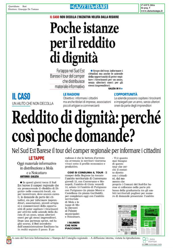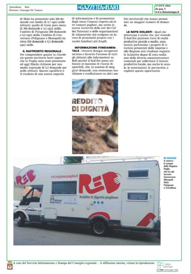 Il titolo è fuorviante, ma il dato che, lunedì scorso, la Gazzetta di Bari ha riportato sulle proprie colonne rispecchia lo stato dei lavori sul Reddito di Dignità (ReD), in Puglia.