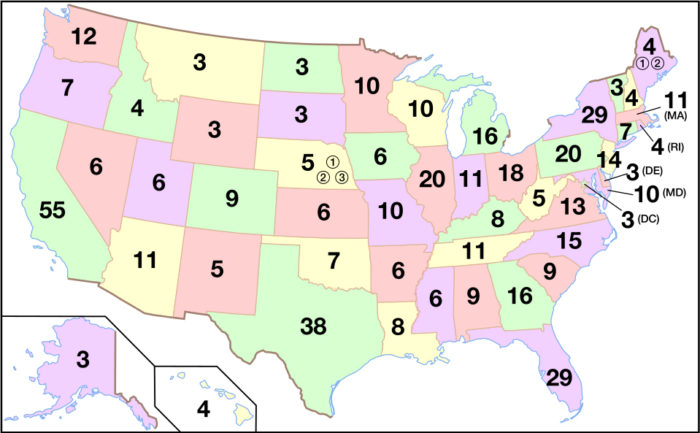 (*) Grandi elettori (Quarantotto Stati hanno il sistema “winner-takes-all”: tutti i voti elettorali vanno alla lista che ottiene il maggior numero di preferenze. Il Maine e il Nebraska attribuiscono 2 voti elettorali al vincitore dello Stato e il resto in base ai distretti del Congresso).(**) Il distretto federale di Washington (District of Columbia) esprime 3 voti nel collegio dei Grandi elettori del Presidente, nel conteggio complessivo è perciò equiparato ad uno Stato.